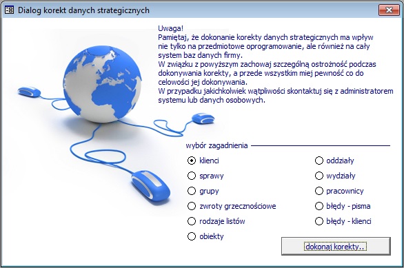 Ewidencja pism (dokumentów) przychodzących i wychodzących. System pozwala na śledzenie krok po kroku, jak załatwiana była dana sprawa. Program charakteryzuję się bardzo dużą wydajnością, dzięki czemu kadrę kancelaryjną można ograniczyć do niezbędnego minimum. Zastosowanie systemu kompetencji dostępu do danych pozwala na zastosowanie poziomowości dekretacji dokumentacji (dyrekcja - wydziały, kierownicy - pracownicy). Niebagatelne znaczenie mają bardzo rozbudowane dialogi wydruków seryjnych, np.: dla poczty przychodzącej: listy pobrań, dzienny wg wydziałów, pisma przeterminowane; dla poczty wychodzącej: załączniki pocztowe, koperty, zwrotne potwierdzenia odbioru, arkusze naklejkowe, itp. Zastosowanie kodów kreskowych pozwala na automatyczne odznaczenie np.: faktu odbioru pisma przez kontrahenta itp. Dzięki multifiltrom użytkownik może w prosty sposób zarządzać danymi (filtrowanie, korekta, rozliczenia, raportowanie, przekroczenia terminów). Za pośrednictwem panelu klientów użytkownik bardzo szybko uzyskuje wszystkie dane interesującego nas kontrahenta (od nazwy firmy poprzez dane teleadresowe do adresu e-mail i strony www).